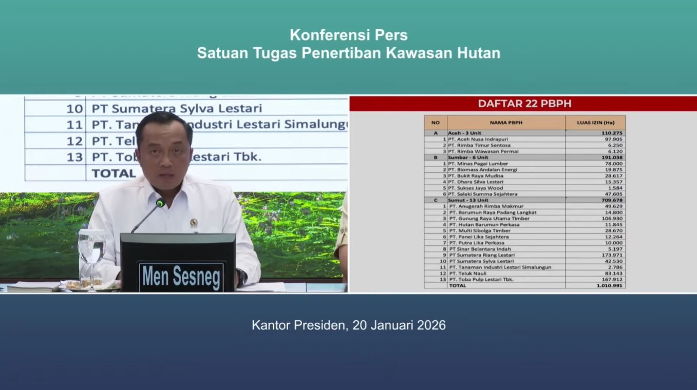 “Berdasarkan laporan tersebut, Bapak Presiden mengambil keputusan mencabut izin 28 perusahaan yang terbukti melakukan pelanggaran,” kata Menteri Sekretaris Negara Prasetyo Hadi dalam konferensi pers di Istana Kepresidenan Jakarta, Selasa (20/1/2026).