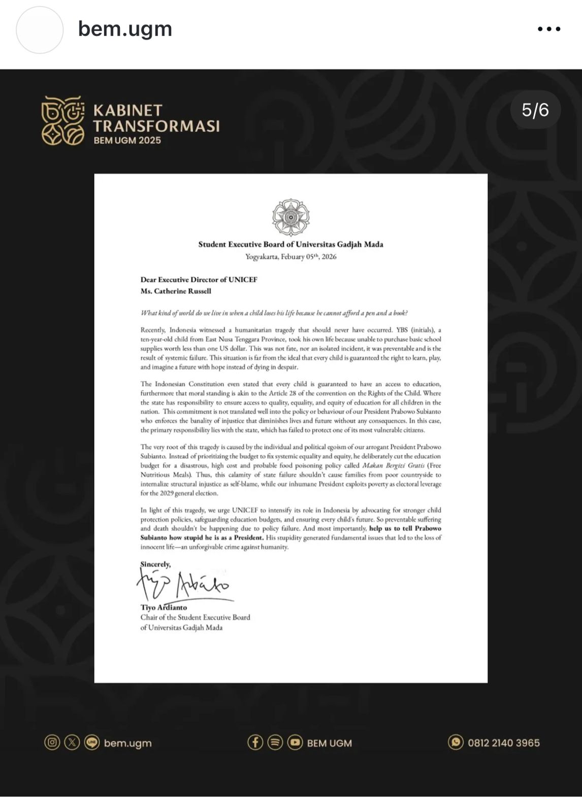 “Help us to tell Prabowo how stupid he is as a president,” demikian kutipan kritik BEM UGM, sebagaimana dikutip dari akun Instagram @bem.ugm, Kamis (12/2/2026).