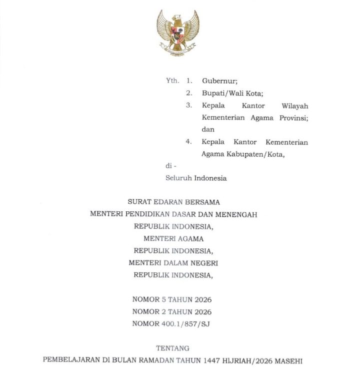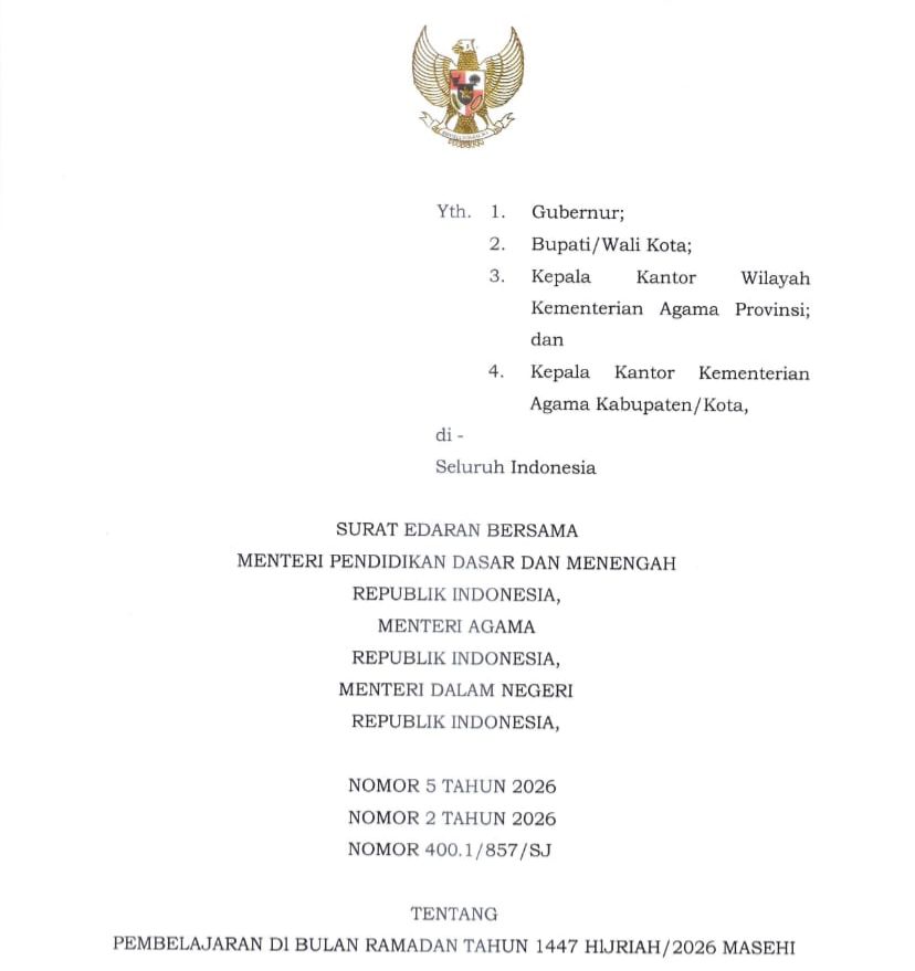 Adapun dalam SEB Nomor 5 Tahun 2026, Nomor 2 Tahun 2026, dan Nomor 400.1/857/SJ tersebut, diatur bahwa pada 18 hingga 21 Februari 2026, siswa akan melaksanakan pembelajaran secara mandiri di lingkungan keluarga.