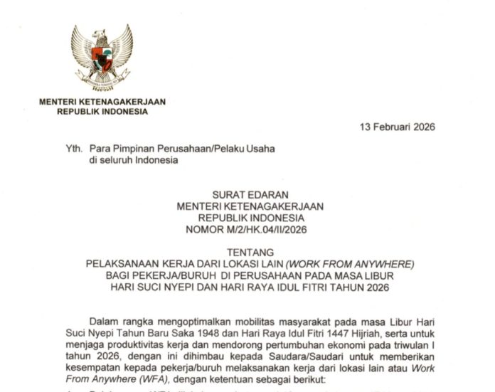 PETISI BRAWIJAYA MEDIA, JAKARTA – Pemerintah melalui Menteri Ketenagakerjaan (Menaker) Yassierli secara resmi menerbitkan Surat Edaran (SE) tentang Work From Anywhere (WFA) atau kerja dari lokasi lain bagi pekerja/buruh sektor swasta pada periode libur Hari Suci Nyepi dan Hari Raya Idulfitri 2026. Kebijakan ini ditujukan untuk memfasilitasi mobilitas masyarakat serta menjaga produktivitas ekonomi di masa libur panjang awal tahun.