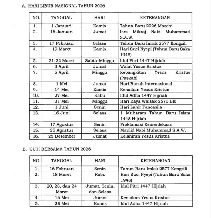 PETISI BRAWIJAYA MEDIA, JAKARTA – Pemerintah Republik Indonesia resmi mengumumkan jadwal libur nasional dan cuti bersama menjelang Hari Raya Idul Fitri 1447 Hijriah / Lebaran 2026 Masehi. Periode liburan ini menjadi momen penting bagi masyarakat untuk merencanakan mudik, berkumpul bersama keluarga, atau liburan panjang.