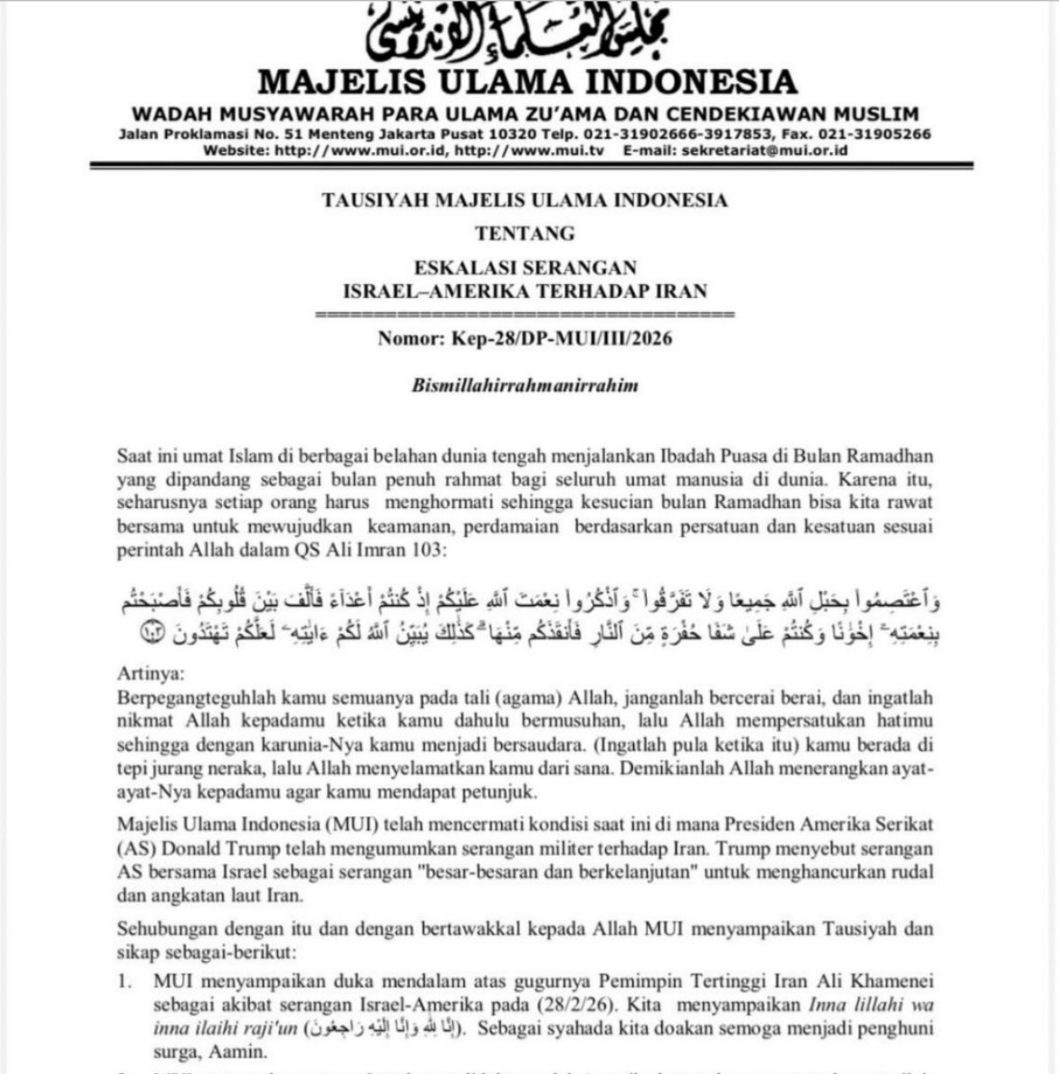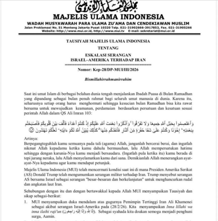 Pernyataan sikap resmi tersebut tertuang dalam Tausiyah bernomor Kep-28/DP-MUI/III/2026, yang dikeluarkan di Jakarta pada Minggu 1 Maret 2026 dan ditandatangani oleh Ketua Umum MUI KH Anwar Iskandar serta Sekretaris Jenderal Buya Amirsyah Tambunan.