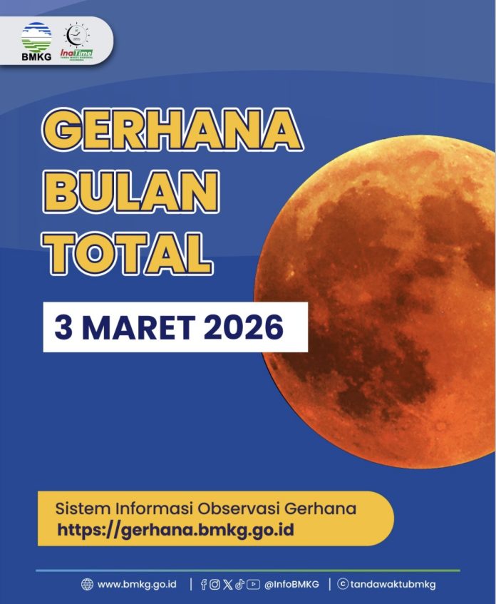 MEDIA PETISI BRAWIJAYA, JAKARTA – Fenomena alam langit yang dinanti-nanti akan kembali terjadi pada Selasa, 3 Maret 2026, saat Gerhana Bulan Total menghiasi langit malam Indonesia. Gerhana Bulan Total terjadi saat Matahari, Bumi, dan Bulan berada dalam satu garis lurus, sehingga Bulan sepenuhnya berada dalam bayangan inti Bumi (umbra).