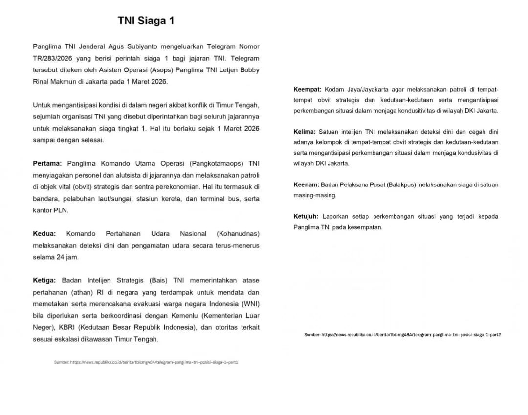 PETISI BRAWIJAYA MEDIA, JAKARTA – Panglima Tentara Nasional Indonesia (TNI) Jenderal Agus Subiyanto memerintahkan seluruh jajaran TNI untuk meningkatkan status kesiapsiagaan menjadi Siaga 1. Perintah tersebut tertuang dalam Telegram Panglima TNI Nomor TR/283/2026 yang ditandatangani oleh Asisten Operasi Panglima TNI Letjen TNI Bobby Rinal Makmun pada 1 Maret 2026.