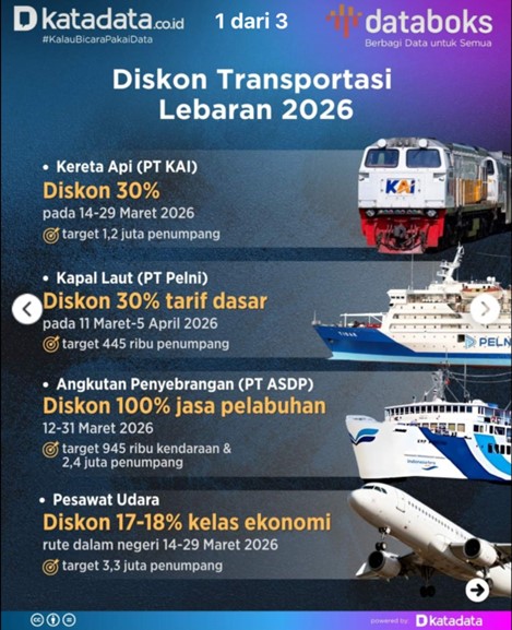 Untuk angkutan laut, masyarakat akan mendapatkan diskon sebesar 30 persen untuk tiket kelas ekonomi di seluruh trayek kapal PSO Pelni. Diskon ini berlaku selama 26 hari, mulai dari 11 Maret 2026 hingga 5 April 2026, dengan target mencapai 445.534 penumpang di 25 kapal.