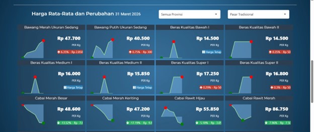 Secara keseluruhan, dinamika harga pangan nasional pada akhir Maret 2026 didominasi oleh penurunan pada komoditas hortikultura dan protein hewani, sementara bahan pokok utama seperti beras relatif stabil.