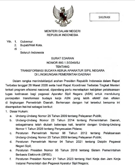 Kebijakan tersebut tertuang dalam SE Nomor 800.1.5/3349/SJ tentang Transformasi Budaya Kerja ASN di Lingkungan Pemerintah Daerah, yang ditandatangani pada 31 Maret 2026 dan mulai berlaku efektif 1 April 2026.