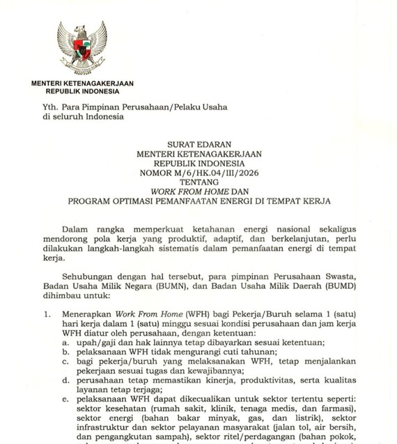PETISI BRAWIJAYA MEDIA, JAKARTA – Kementerian Ketenagakerjaan (Kemnaker) resmi menerbitkan Surat Edaran (SE) Menteri Ketenagakerjaan Nomor M/6/HK.04/III/2026 tentang Work From Home (WFH) dan Program Optimasi Pemanfaatan Energi di Tempat Kerja. Kebijakan ini menegaskan bahwa pelaksanaan WFH tidak boleh mengurangi hak pekerja, termasuk upah dan cuti.