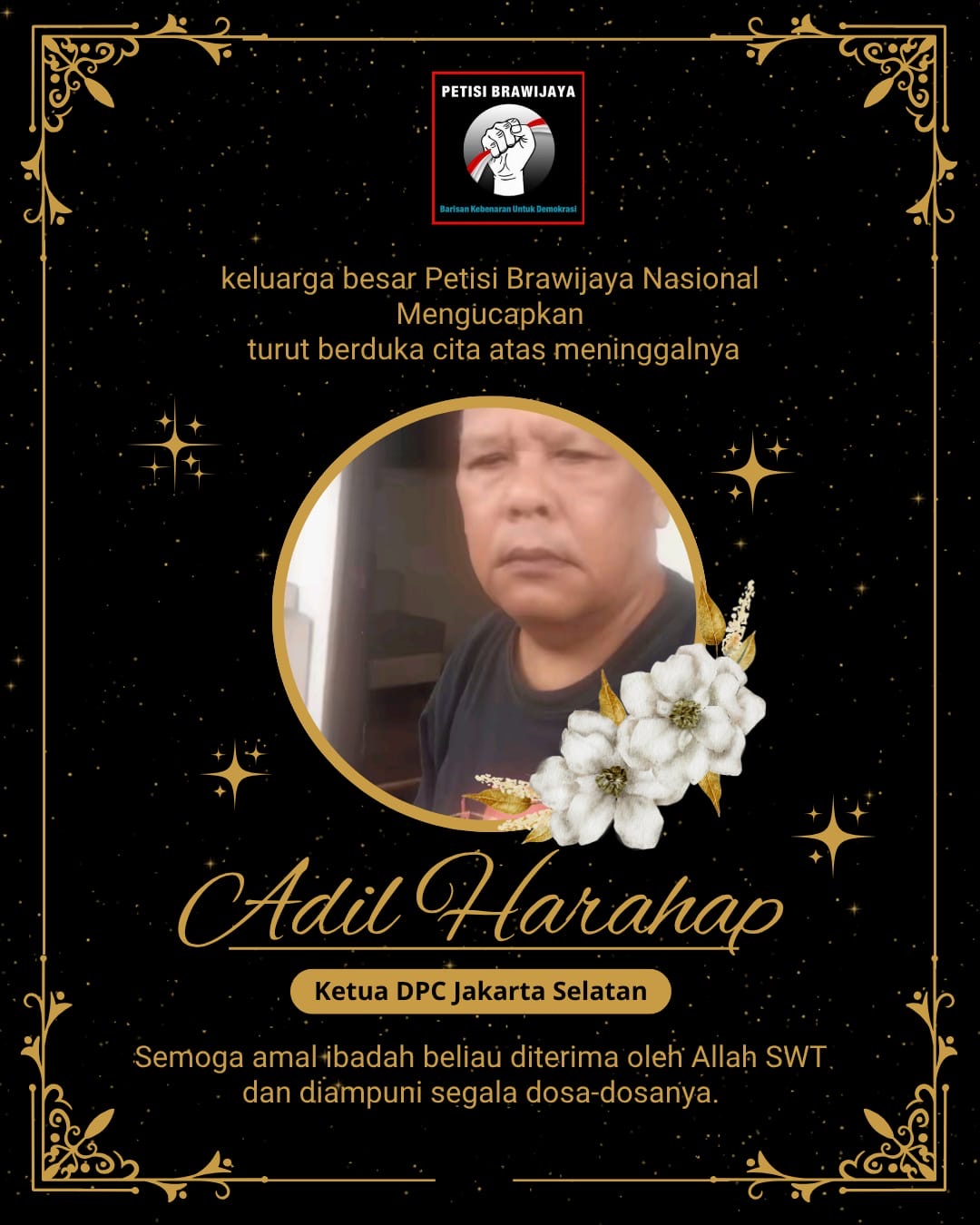 PETISI BRAWIJAYA MEDIA, JAKARTA – Berita Duka Cita, Telah berpulang Kepangkuan Bapa di Sorga, *Saudara kita, Teman Berjuang Kita, Terbaik Kita – yakni ADIL HARAHAP* – *Ketua DPC PETISI BRAWIJAYA JAKARTA SELATAN*
