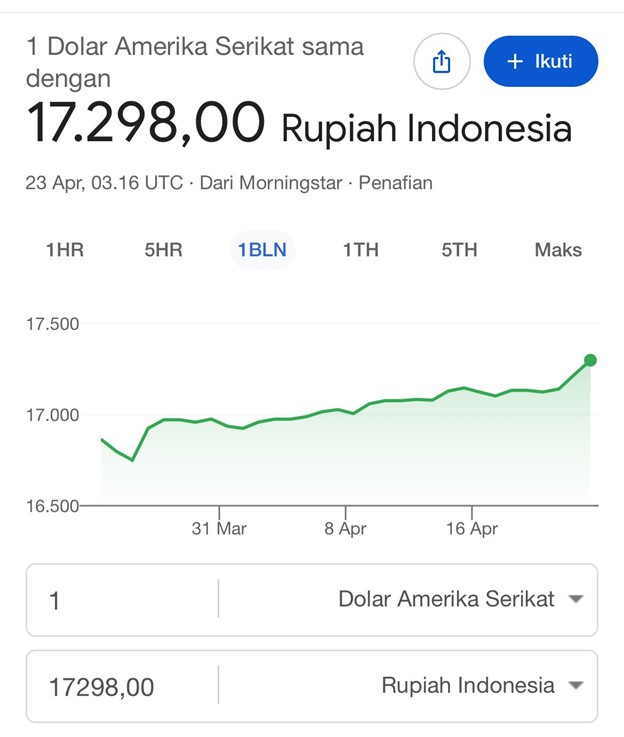 Sebelumnya pada Rabu (22/4/2026), rupiah melemah 38 poin ke level Rp 17.181 per dolar AS. Pelemahan berlanjut pada sesi berikutnya hingga akhirnya menembus level Rp17.298 pada Kamis, (23/4/2026) pukul 10.20 WIB.