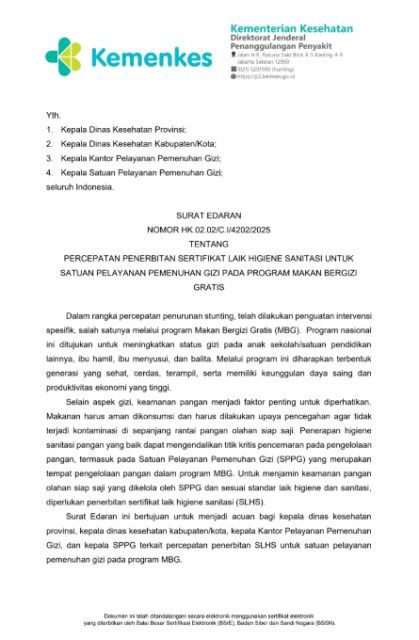 Surat edaran ini ditandatangani oleh Plt. Direktur Jenderal Penanggulangan Penyakit, drg. Murti Utami, pada 1 Oktober 2025 dan ditujukan kepada seluruh kepala dinas kesehatan provinsi, kabupaten/kota, serta kepala Kantor Pelayanan dan SPPG di seluruh Indonesia.